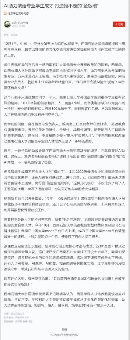 西南石油大學(xué)外國(guó)語(yǔ)學(xué)院黨委書(shū)記姚明淑認(rèn)為,俄語(yǔ)學(xué)科人才培養(yǎng)亟需快速應(yīng)對(duì)挑戰(zhàn),主動(dòng)求變。學(xué)校利用人工智能推動(dòng)教學(xué)模式從工業(yè)化向智能化的變革,助力培養(yǎng)更多明立場(chǎng)、知世界、懂AI、融學(xué)科、精專(zhuān)業(yè)的“外語(yǔ)+”高水平人才。