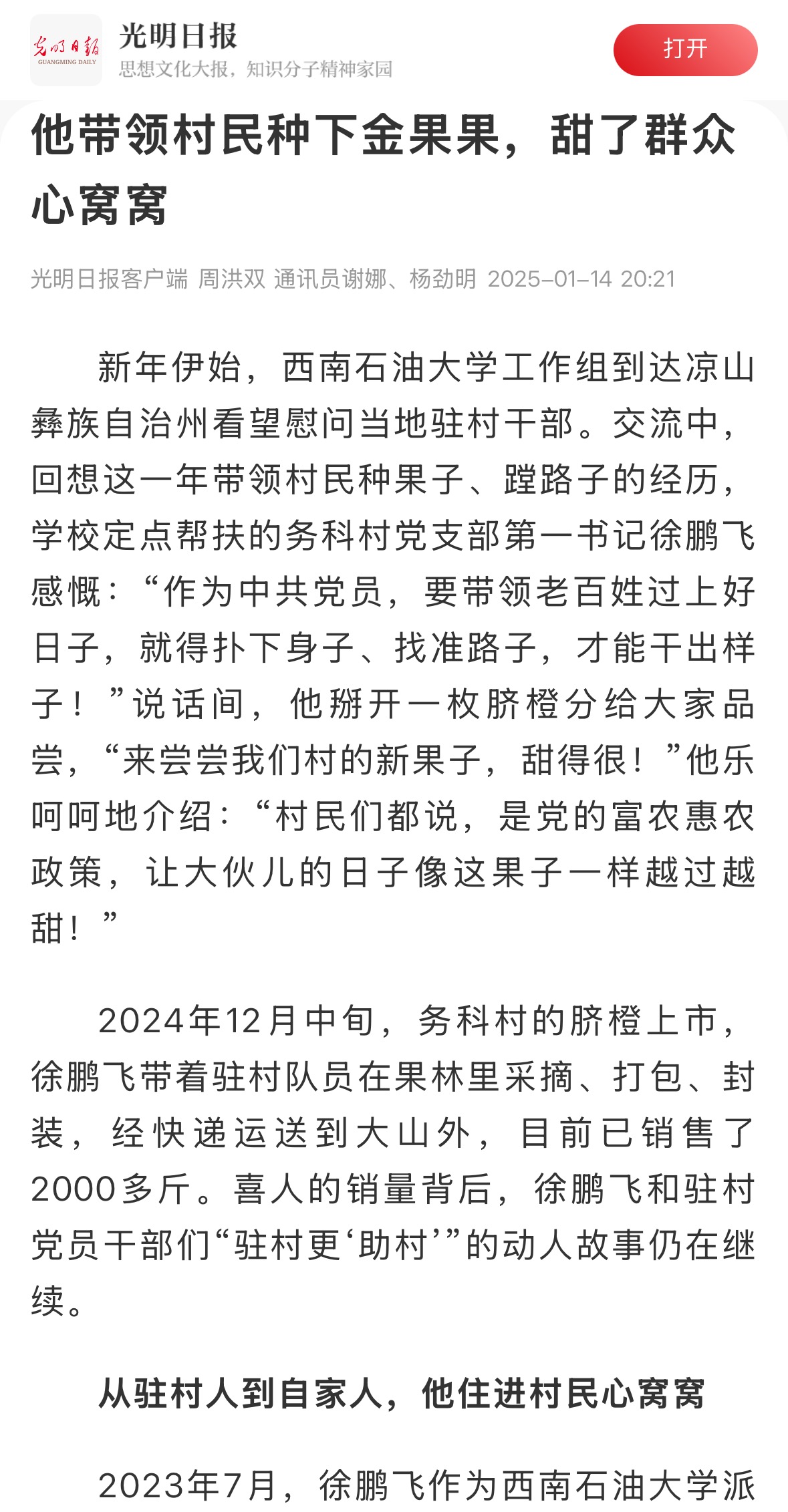 新年伊始,西南石油大學工作組到達涼山彝族自治州看望慰問當地駐村干部。交流中,回想這一年帶領村民種果子、蹚路子的經歷,學校定點幫扶的務科村黨支部第一書記徐鵬飛感慨:“作為中共黨員,要帶領老百姓過上好日子,就得撲下身子、找準路子,才能干出樣子!”說話間,他掰開一枚臍橙分給大家品嘗,“來嘗嘗我們村的新果子,甜得很!”他樂呵呵地介紹:“村民們都說,是黨的富農惠農政策,讓大伙兒的日子像這果子一樣越過越甜!”