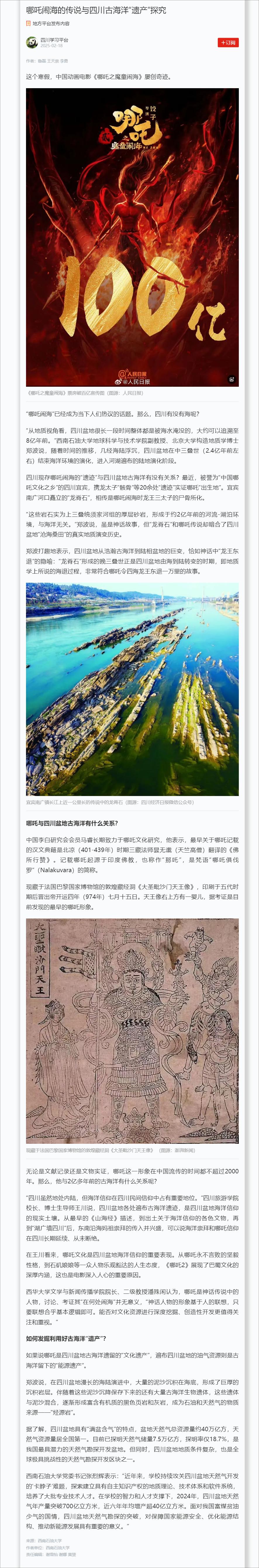 四川現存哪吒鬧海的“遺跡”與四川盆地古海洋有沒有關系?最近,被譽為“中國哪吒文化之鄉”的四川宜賓,攜龍太子“骸骨”等20余處“遺跡”實證哪吒“出生地”。宜賓南廣河口矗立的“龍脊石”,相傳是哪吒鬧海時龍王三太子的尸骨所化。