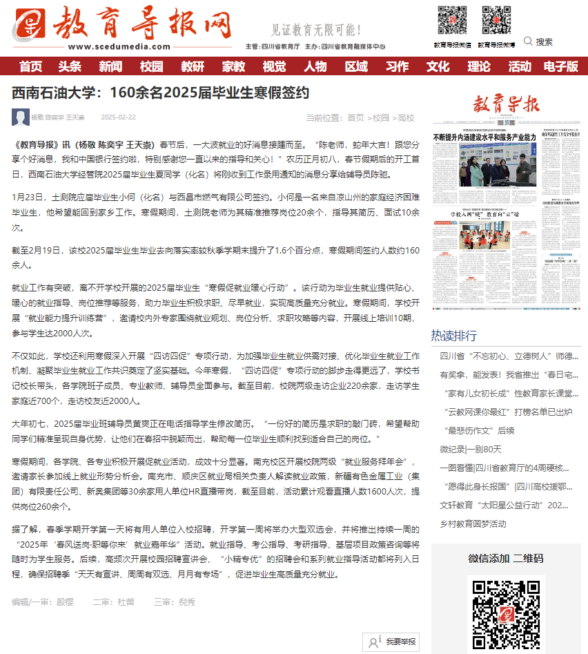 針對2025屆高校畢業(yè)生就業(yè)問題,四川教育部門和各高校利用寒假窗口期,通過“六抓六促”,全面開展“寒假促就業(yè)暖心行動”,為高校畢業(yè)生鋪就高質(zhì)量就業(yè)“快車道”。以西南石油大學為例,截至2月19日,2025屆畢業(yè)生畢業(yè)去向落實率較秋季學期末提升1.6個百分點,簽約人數(shù)160余人。