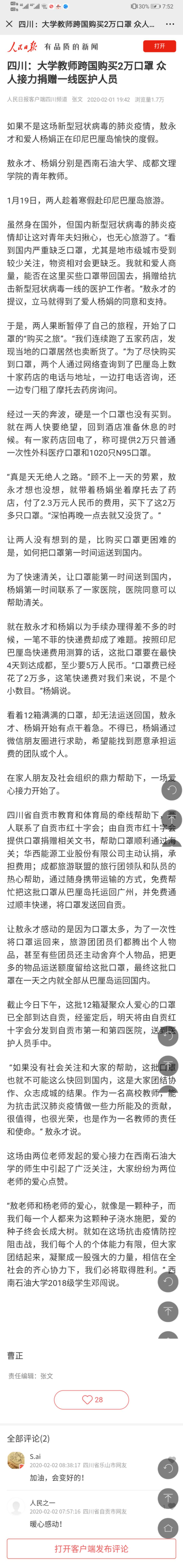 “如果沒有社會關注和大家的幫助,這批口罩也就不可能這么快回到國內,這是大家團結協作、眾志成城的結果。作為一名高校教師,能為抗擊武漢新型冠狀病毒肺炎疫情做一些力所能及的貢獻,很值得,也很光榮,也是作為一名教師的責任和使命。” 敖永才說。