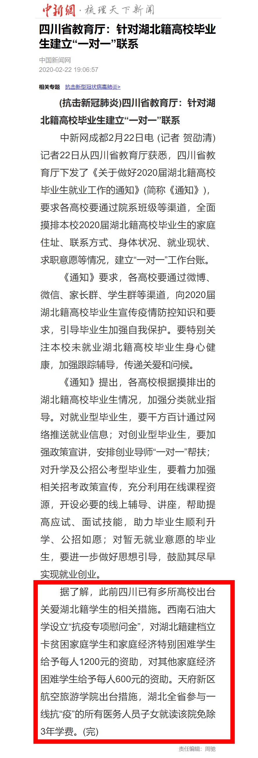 據(jù)了解,此前四川已有多所高校出臺關(guān)愛湖北籍學(xué)生的相關(guān)措施。西南石油大學(xué)設(shè)立“抗疫專項慰問金”,對湖北籍建檔立卡貧困家庭學(xué)生和家庭經(jīng)濟特別困難學(xué)生給予每人1200元的資助,對其他家庭經(jīng)濟困難學(xué)生給予每人600元的資助。天府新區(qū)航空旅游學(xué)院出臺措施,湖北全省參與一線抗“疫”的所有醫(yī)務(wù)人員子女就讀該院免除3年學(xué)費。(完)