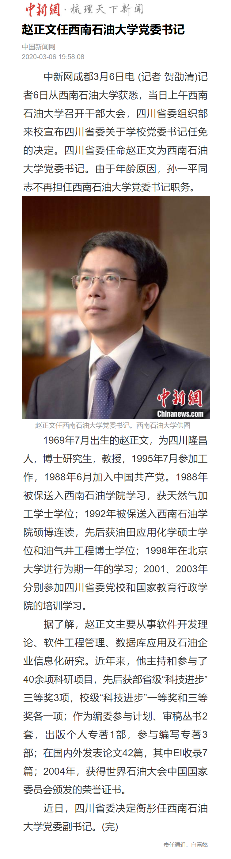 中新網成都3月6日電 (記者 賀劭清)記者6日從西南石油大學獲悉,當日上午西南石油大學召開干部大會,四川省委組織部來校宣布四川省委關于學校黨委書記任免的決定。四川省委任命趙正文為西南石油大學黨委書記。由于年齡原因,孫一平同志不再擔任西南石油大學黨委書記職務。