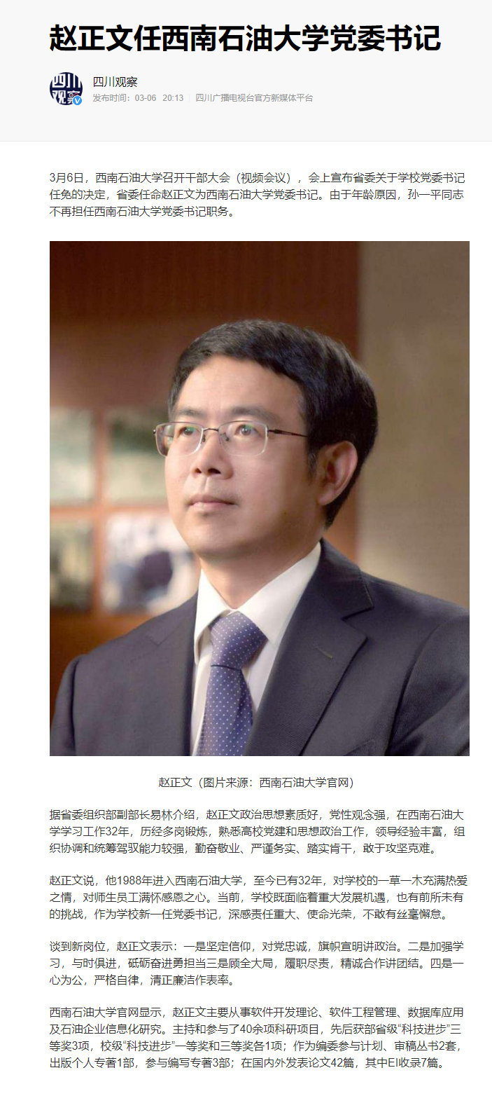 3月6日,西南石油大學召開干部大會(視頻會議),會上宣布省委關于學校黨委書記任免的決定,省委任命趙正文為西南石油大學黨委書記。由于年齡原因,孫一平同志不再擔任西南石油大學黨委書記職務。