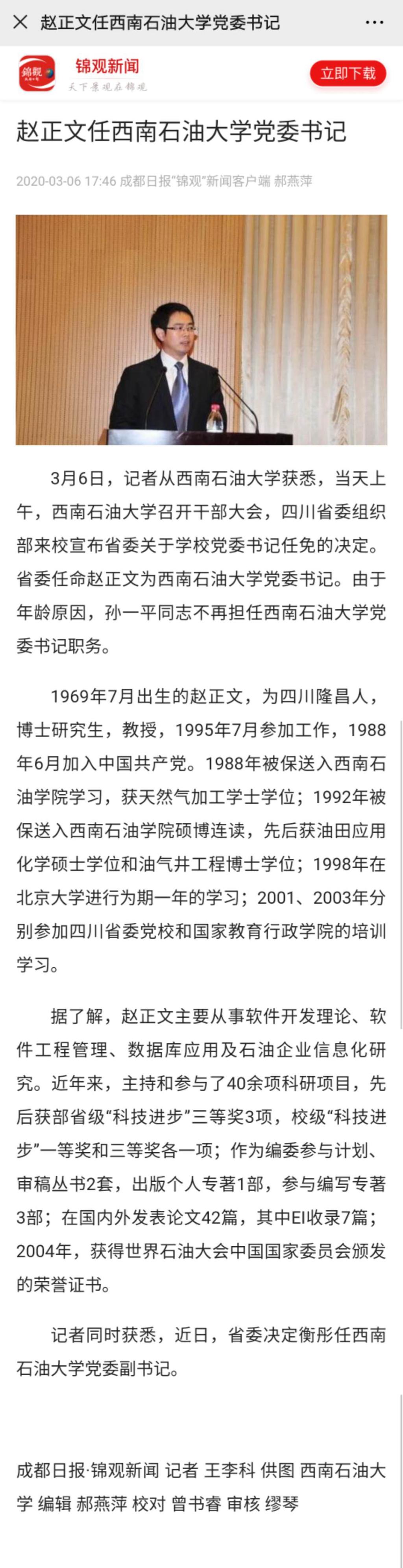 3月6日,記者從西南石油大學(xué)獲悉,當(dāng)天上午,西南石油大學(xué)召開干部大會,四川省委組織部來校宣布省委關(guān)于學(xué)校黨委書記任免的決定。省委任命趙正文為西南石油大學(xué)黨委書記。由于年齡原因,孫一平同志不再擔(dān)任西南石油大學(xué)黨委書記職務(wù)。
