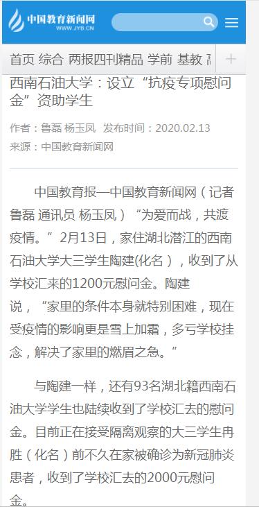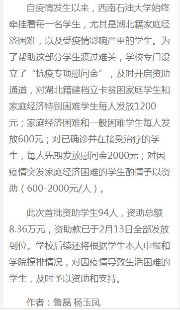 自疫情發生以來,西南石油大學始終牽掛著每一名學生,尤其是湖北籍家庭經濟困難,以及受疫情影響嚴重的學生。為了幫助這部分學生渡過難關,學校專門設立了“抗疫專項慰問金”,及時開啟資助通道,對湖北籍建檔立卡貧困家庭學生和家庭經濟特別困難學生每人發放1200元;家庭經濟困難和一般困難學生每人發放600元;對已確診并在接受治療的學生,每人先期發放慰問金2000元;對因疫情突發家庭經濟困難的學生酌情予以資助(600-2000元/人)。