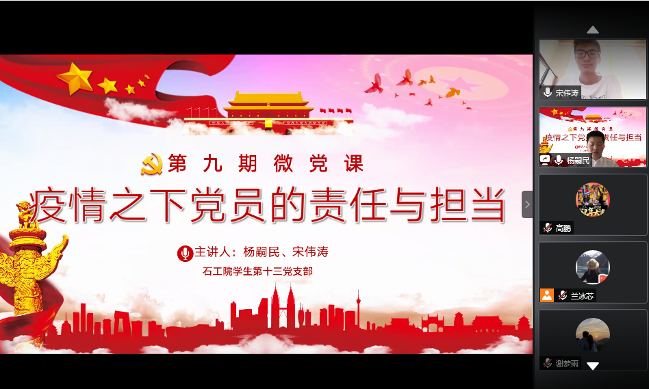 近日,石工院學生第十三黨支部線上翻轉微黨課在黨支部書記蘭冰芯的帶領下已經舉辦了兩期。與以往不同的是,這兩次的微黨課通過預備黨員講黨課,實現了教育主體的身份翻轉。