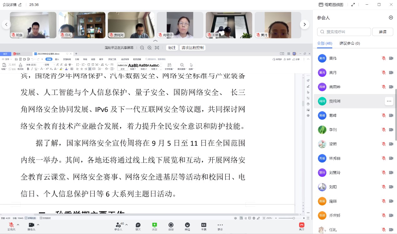 會(huì)上,蒲和平以PPT的形式組織大家學(xué)習(xí)了《致全校師生員工的疫情防控倡議書》、《關(guān)于堅(jiān)決落實(shí)成都市疫情防控新要求的通知》以及《2022年國(guó)家網(wǎng)絡(luò)安全宣傳周啟動(dòng)》。