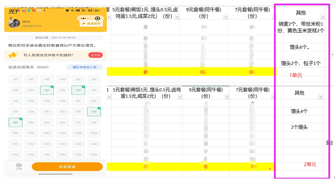 “老師,晚餐我不想訂套餐,我就想買兩個饅頭,兩個燒麥。”為了滿足住戶早中晚三餐特殊的非標準需求,志愿者們立即商討,優化訂購接龍微信小程序,增設需求反饋欄目,增加住戶訂購需求的反饋渠道。于是,一個個燒麥、發糕、一份份帶絲米粉……陸續送到住戶手中。