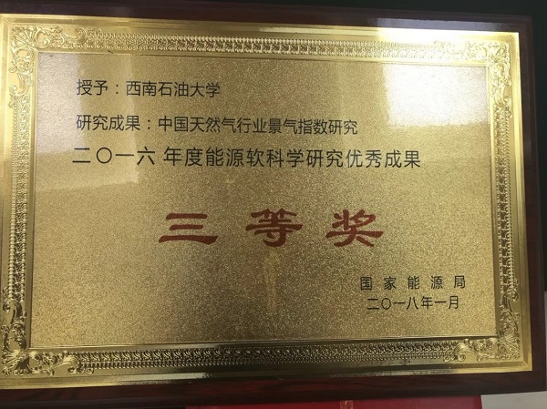 2018年2月6日,“2016年度能源軟科學研究優秀成果交流座談會”在北京召開,會議公布了《2016年度能源軟科學研究優秀成果獲獎名單》,共40項研究成果獲獎,中心沈西林教授研究團隊研究成果“中國天然氣行業景氣指數”獲三等獎。國家能源局副局長綦成元出席會議并為獲獎單位和個人頒獎。