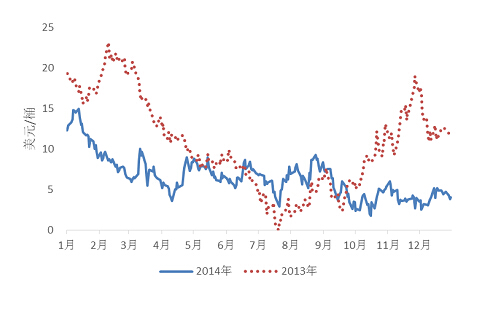 圖2. 2013、2014年Brent與WTI原油價格之差(數據來源:EIA)
