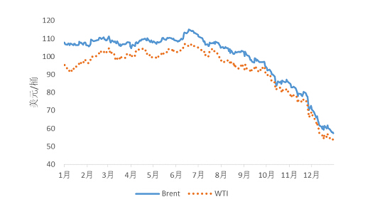 12月份以來,原油期貨價格繼續走低。以沙特為首的OPEC國家先后下調原油官方銷售價,令市場價格戰不斷升級;投行一致看空未來油價走勢,大幅下調油價預期;美國石油庫存驟增,需求疲軟,而且沙特不減產姿態堅定,令原油市場繼續承受重壓,跌勢難止,迅速跌破每桶60 美元關口,截至2014年12月31日,Brent和WTI油價分別跌至每桶57.33美元和每桶53.27美元,較最高點跌幅分別達到了50.2%和50.3%。