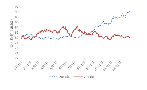 圖5. 2013,2014年美元指數對比圖(數據來源:EIA,Wind)