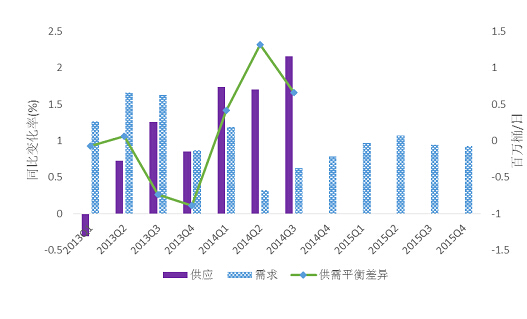 基于全球經濟保守預期,IEA和EIA等機構連續下調了全球原油需求預測。從國際原油市場供需情況來看,2014年需求同比變化率小于2013年,而供應同比變化率卻大幅增加,致使供需平衡差異有所擴大(如圖4)。IEA在2014年12月發布的《石油市場月度報告》將2015年全球石油增長預期繼續下調23萬桶至90萬桶/日,全球原油需求將增長93.3百萬桶/日,略高于2014年的92.4百萬桶/日,并指出這主要是受到俄羅斯和其他石油出口國燃料消費下滑影響。