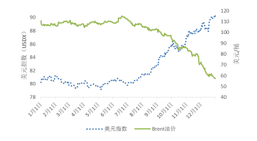 圖6. 2014年美元指數與Brent油價對比圖(數據來源:EIA,Wind)