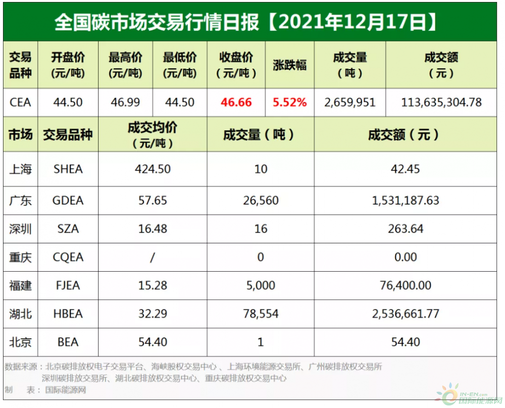 今日(12月17日)全國碳市場碳排放配額(CEA)掛牌協議交易成交量645,303噸,成交額30,112,395.39元,開盤價44.50元/噸,最高價46.99元/噸,最低價44.50元/噸,收盤價46.66元/噸,收盤價較前一日上漲5.52%。今日大宗協議交易成交量2,014,648噸,成交額83,522,909.39元。今日全國碳排放配額(CEA)總成交量2,659,951噸,總成交額113,635,304.78元。