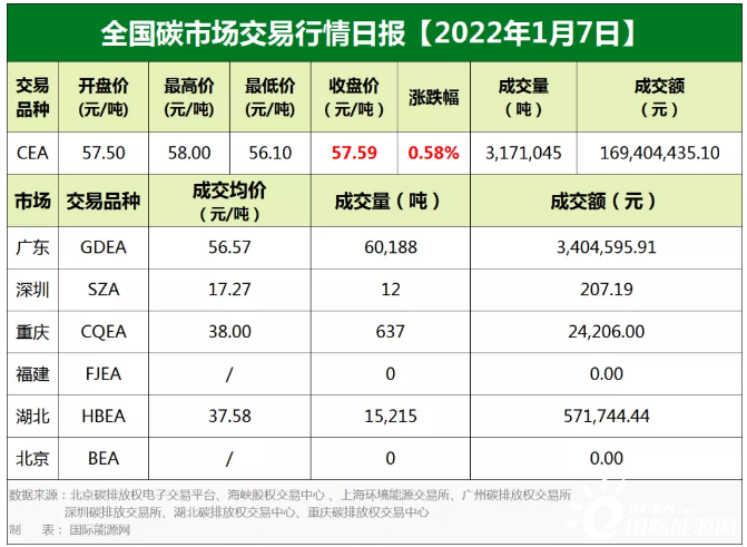 1月7日全國碳市場碳排放配額(CEA)掛牌協議交易成交量366,101噸,成交額21,082,978.10元,開盤價57.50元/噸,最高價58.00元/噸,最低價56.10元/噸,收盤價57.59元/噸,收盤價較前一日上漲0.58%。今日大宗協議交易成交量2,804,944噸,成交額148,321,457.00元。今日全國碳排放配額(CEA)總成交量3,171,045噸,總成交額169,404,435.10元。