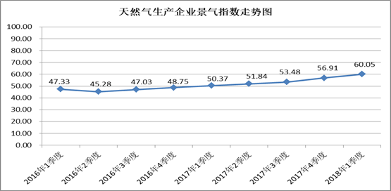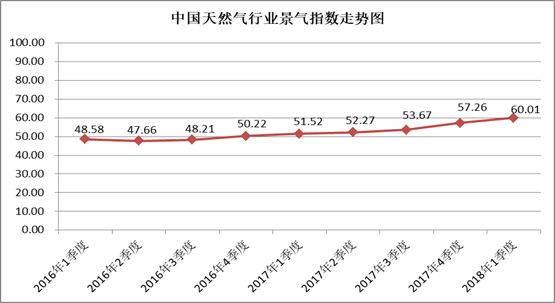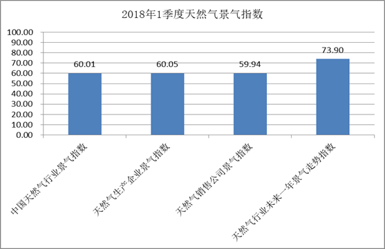 中國天然氣行業(yè)景氣指數(shù)統(tǒng)計(jì)結(jié)果顯示:2018年1季度中國天然氣行業(yè)景氣指數(shù)為60.01,處于較景氣狀態(tài);天然氣生產(chǎn)企業(yè)景氣指數(shù)為60.05,處于較景氣狀態(tài);天然氣銷售公司景氣指數(shù)為59.94,處于一般景氣狀態(tài);天然氣行業(yè)未來一年景氣走勢指數(shù)為73.90,處于較景氣狀態(tài)。