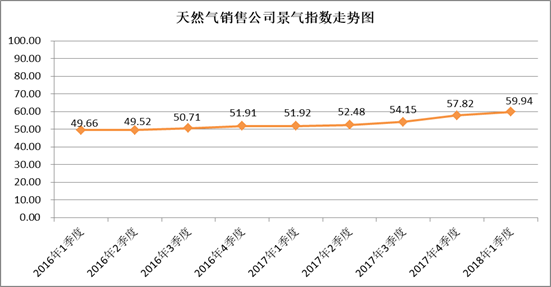 2018 年 1 季度天然氣銷售公司景氣指數(shù)為 59.94,處于一般景氣狀態(tài),與2017年4季度相比有所上升,季節(jié)景氣變動(dòng)系數(shù)為 1.037。其中,除供求關(guān)系保持不變外,產(chǎn)品銷量、經(jīng)營狀況、就業(yè)人員、員工收入較上季度均有所上升,價(jià)格水平則略有下降。