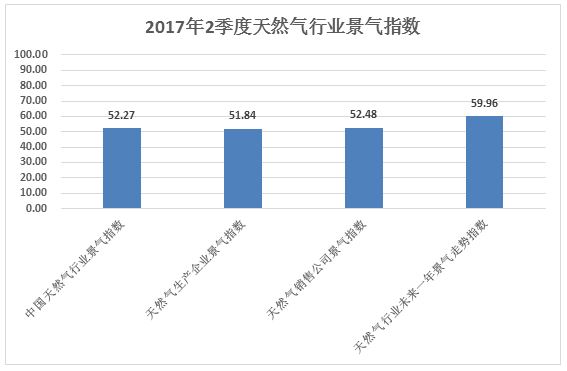 2017年2季度統計的天然氣行業未來一年景氣走勢指數為59.96,未來一年天然氣行業處于一般景氣狀態,與2017年1季度的56.60相比有較大幅度上升,季節景氣變動系數為1.055。其中天然氣行業專家、天然氣生產企業相關專家對天然氣行業未來一年景氣走勢判斷指標與2017年1季度相比有較大幅度上升,天然氣銷售公司相關專家對天然氣行業未來一年景氣走勢判斷指標與2017年1季度相比上升幅度較小。
