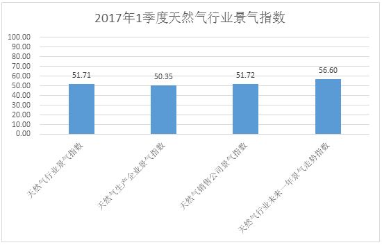 2017年1季度中國天然氣行業景氣指數為51.71,處于一般景氣狀態,與2016年4季度景氣指數50.22相比有所上升,季節景氣變動系數為1.030。從統計數據看,與2016年4季度比較:宏觀經濟指標基本保持不變,天然氣進口狀態指標大幅上升,天然氣行業專家判斷指標有較大幅度上升,天然氣生產企業經營狀態指標有較大幅度上升,天然氣銷售公司經營狀態指標小幅下降。因此2017年1季度中國天然氣行業景氣指數總體呈現上升態勢。