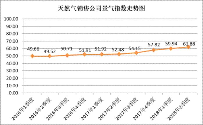 2018 年 2 季度天然氣銷售公司景氣指數為61.88,處于較景氣狀態,與2018年1季度相比有一定幅度上升,季節景氣變動系數為 1.032。其中,供求關系、價格水平、產品銷量、就業人員、員工收入較上季度均有小幅上升。