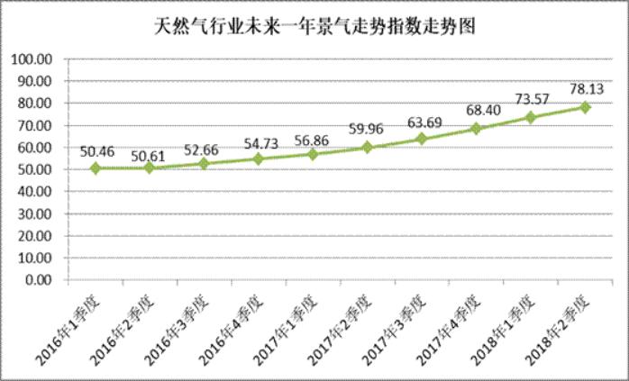 2018年2季度統計的天然氣行業未來一年景氣走勢指數為78.13,未來一年天然氣行業處于較景氣狀態,與2018年1季度的73.57相比有較大幅度上升,其季度變動系數為 1.062。其中,天然氣行業專家、天然氣生產企業相關專家、天然氣銷售公司相關專家對天然氣行業未來一年景氣走勢判斷,均持樂觀態度。