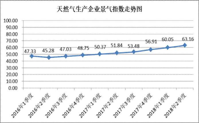 2018 年 2 季度國內天然氣生產企業運營狀況有所改善,天然氣生產企業景氣指數為 63.16,處于較景氣狀態,與2018年1季度相比有較大幅度上升,季節景氣變動系數為 1.052。其中,投資水平、產能變化、產能利用、企業產量、價格變化較上季度均有一定幅度上升,經營狀況則出現較大幅度上升,就業人員出現小幅下降,員工收入在本季度基本保持不變。