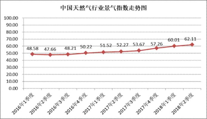 中國天然氣行業景氣指數統計結果顯示:2018年2季度中國天然氣行業景氣指數為62.11,處于較景氣狀態;天然氣生產企業景氣指數為63.16,處于較景氣狀態;天然氣銷售公司景氣指數為61.88,處于較景氣狀態;天然氣行業未來一年景氣走勢指數為78.13,處于較景氣狀態。