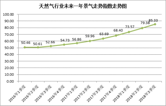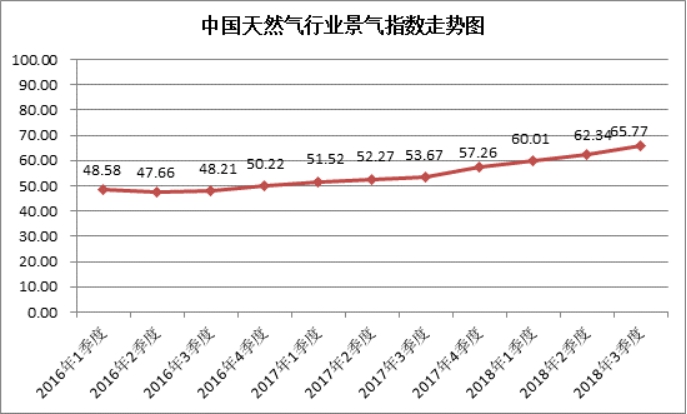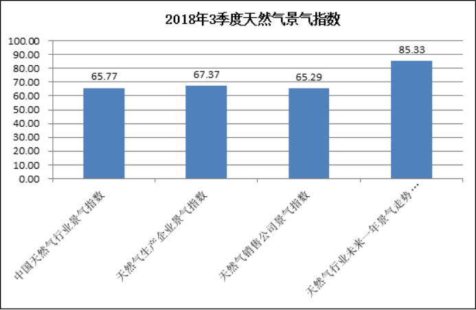 中國天然氣行業景氣指數統計結果顯示:2018年3季度中國天然氣行業景氣指數為65.77,處于較景氣狀態;天然氣生產企業景氣指數為67.37,處于較景氣狀態;天然氣銷售公司景氣指數為65.29,處于較景氣狀態;天然氣行業未來一年景氣走勢指數為85.33,天然氣行業未來一年可能進入很景氣狀態。