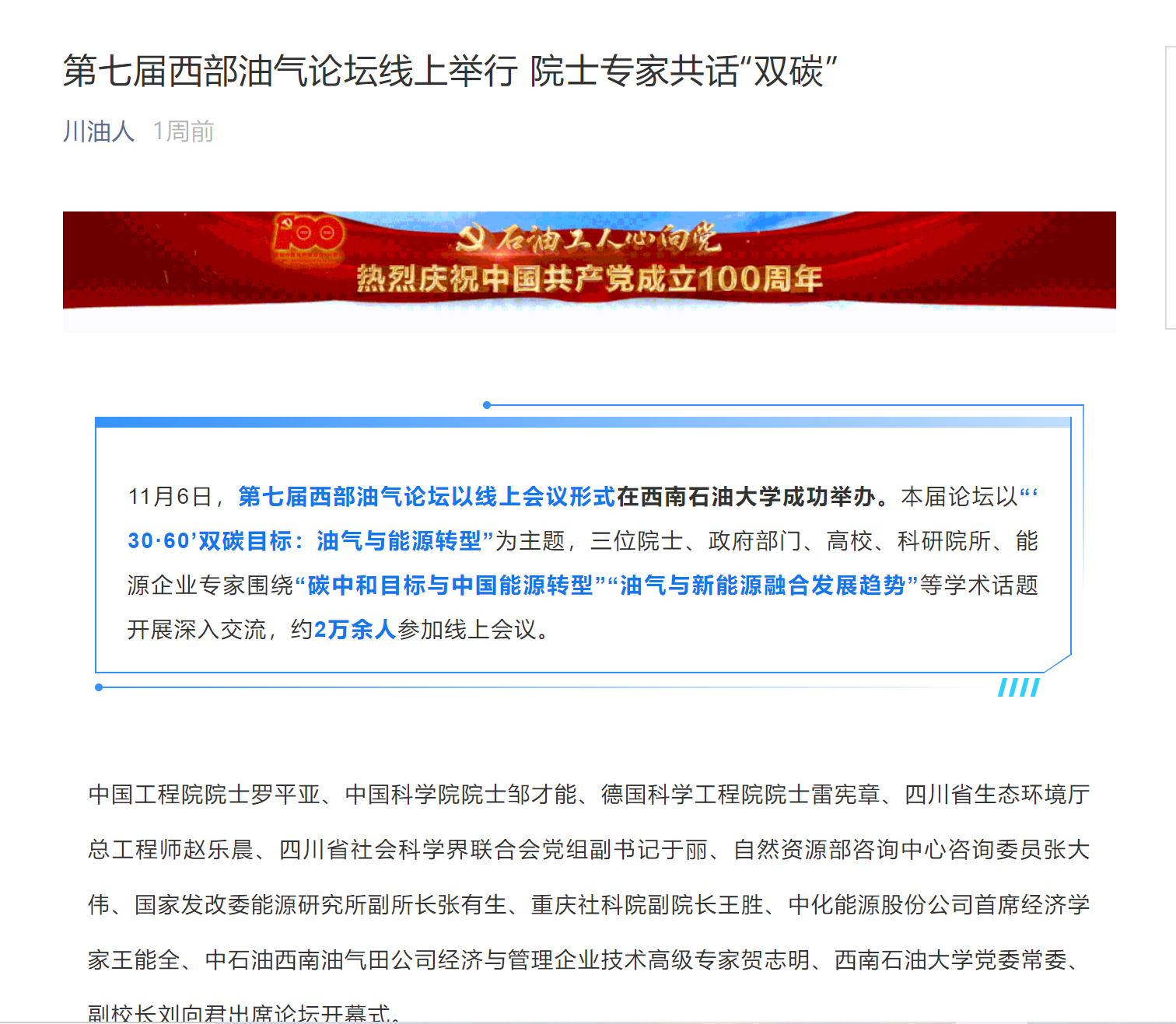第七屆西部油氣論壇線上舉行 院士專家共話“雙碳” ---川油人