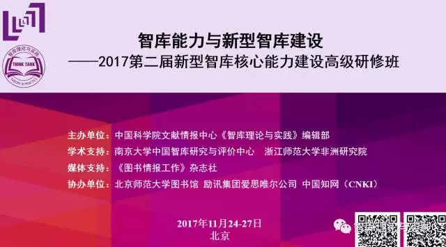 2017年11月25日,智庫能力與新型智庫建設——2017第二屆新型智庫核心能力建設高級研修班在北京師范大學圖書館召開。本次研修班由中國科學院文獻情報中心《智庫理論與實踐》編輯部主辦,北京師范大學圖書館、勵訊集團愛思唯爾公司、中國知網(CNKI)協辦,南京大學中國智庫研究與評價中心、浙江師范大學非洲研究院提供學術支持,《圖書情報工作》雜志社提供媒體支持。四川石油天然氣發展研究中心執行主任陳軍華參加了此次研修班學習與交流。