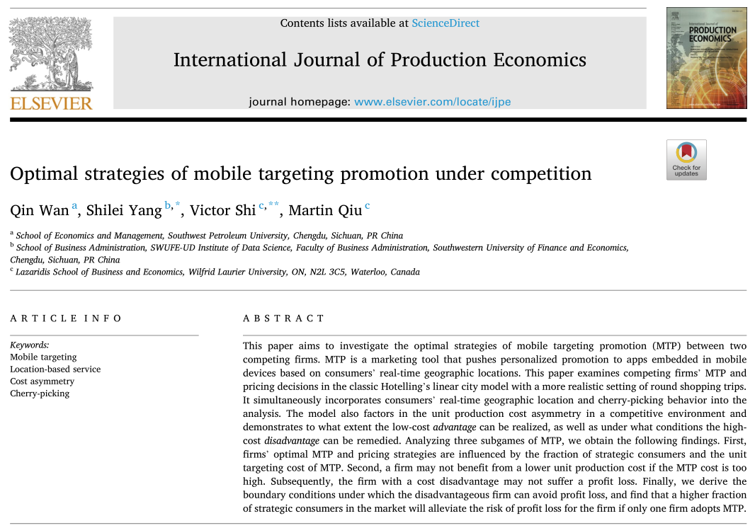 我院萬琴副教授在《International Journal of Production Economics》(JCR一區(qū),2021年最新影響因子:5.134)上成功發(fā)表題為“Optimal strategies of mobile targeting promotion under competition”(WOS:000658519400011)的學術論文。該論文同時被SSCI(社會科學引文索引)和SCI(科學引文索引)收錄。