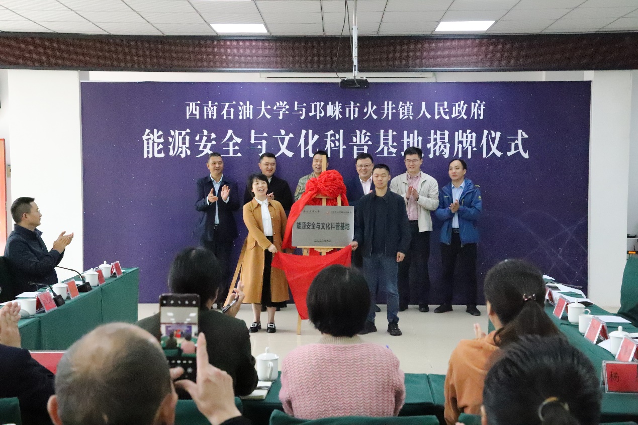 陳怡男與付建國(guó)共同為“西南石油大學(xué)與崍市火井鎮(zhèn)人民政府能源安全與文化科普基地”揭牌。
