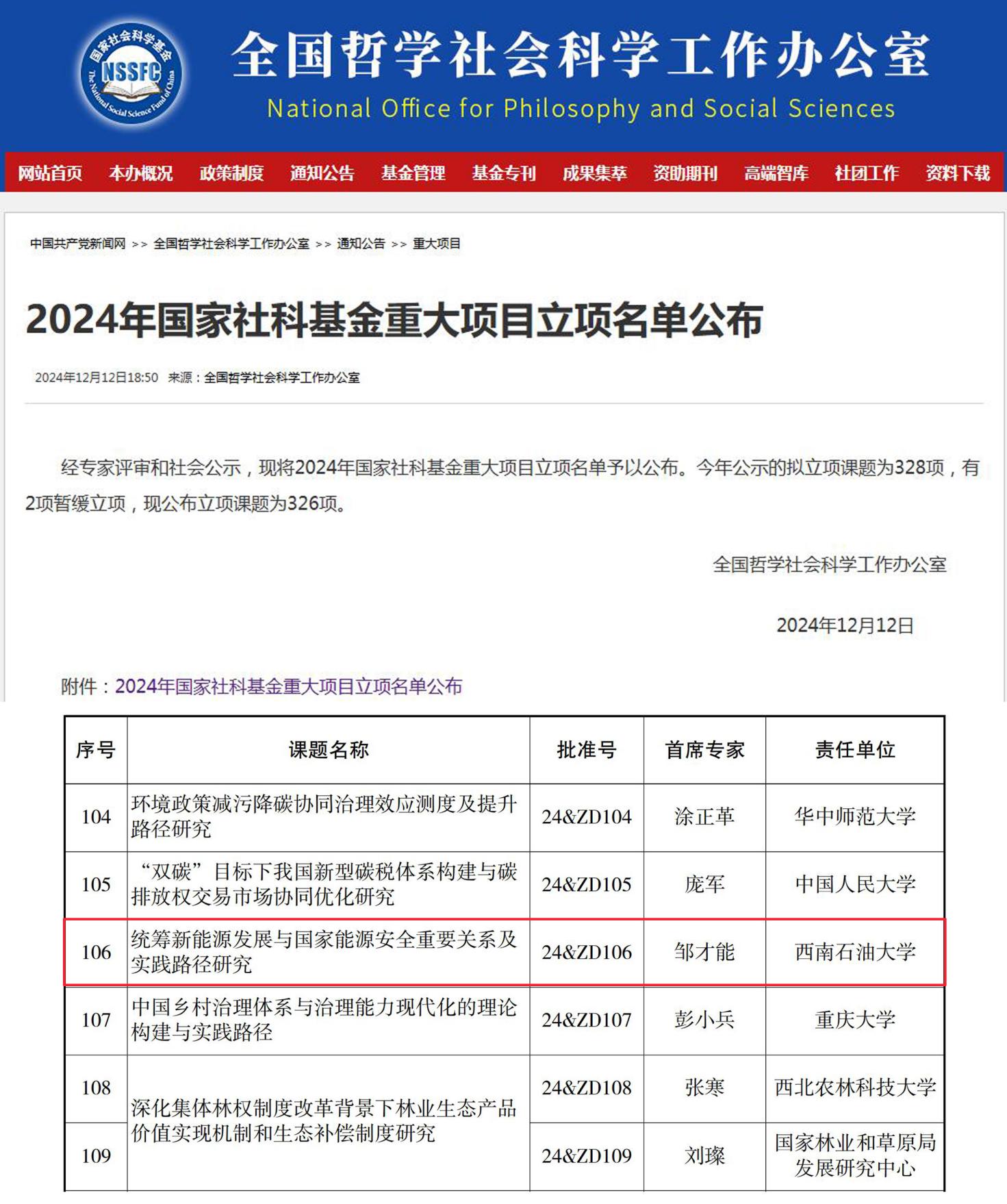 12月12日,全國哲學社會科學工作辦公室公布了2024年度國家社科基金重大項目立項名單,由我校經濟管理學院鄭小強教授、李廷副教授團隊組織申報的“統籌新能源發展與國家能源安全重要關系及實踐路徑研究”(24&ZD106)獲準立項。我校兼職博導、中國科學院院士鄒才能擔任該項目首席專家,西南石油大學、國家發展改革委能源研究所、中國石油經濟技術研究院、華北電力大學、西南財經大學五家單位聯合攻關。