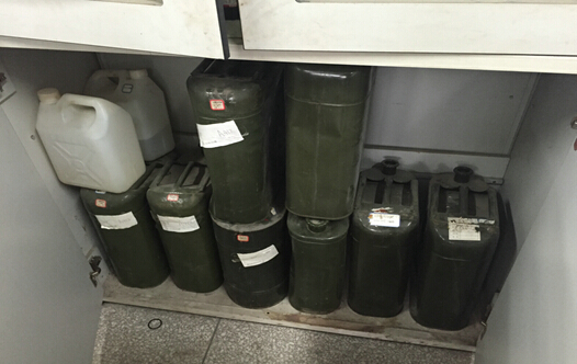 3、A412房間將數(shù)個(gè)裝有汽油的油桶放置于藥品柜中,雖使用了耐沖擊的專(zhuān)用油桶,但檢查人員在藥品柜中仍然可以聞到明顯的汽油味,存在一定的安全隱患。