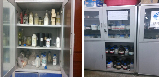 3、實(shí)驗(yàn)室的化學(xué)藥品保管極不規(guī)范,國(guó)A203、國(guó)B206等房間的藥品柜均沒(méi)有上鎖,有些柜門(mén)掉了一年了也沒(méi)有修復(fù),或者有些直接放置于開(kāi)架實(shí)驗(yàn)臺(tái)上,其中有濃硫酸、濃硝酸、甲苯、丙酮等強(qiáng)腐蝕性酸和易制毒藥品。沒(méi)有藥品清單,沒(méi)有使用記錄,檢查人員都可以隨便帶走幾瓶,非常危險(xiǎn)。