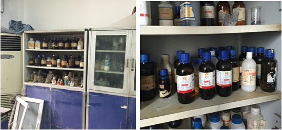 2、四樓、五樓的大部份實(shí)驗(yàn)室沒(méi)有藥品柜,更沒(méi)有使用記錄,甲苯、丙酮、濃硫酸等易制毒藥品就放置于開(kāi)架實(shí)驗(yàn)臺(tái)上,管理極不規(guī)范。如B412,實(shí)驗(yàn)室門(mén)開(kāi)著卻沒(méi)有學(xué)生,因?yàn)檠芯可诹硗庖婚g相隔較遠(yuǎn)的辦公室,檢查人員進(jìn)入實(shí)驗(yàn)室?guī)追昼姾?,學(xué)生才被通知過(guò)來(lái),該實(shí)驗(yàn)室存放有濃硫酸,放置在未上鎖的藥品柜中,一旦有不法分子將其帶出,后果不堪設(shè)想。