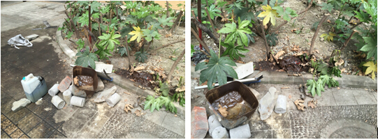 1、國(guó)AB樓之間天井中有兩桶廢油丟棄在生活垃圾筒旁邊,還有一堆固體廢物直接倒在綠化帶上,對(duì)環(huán)境造成嚴(yán)重的污染。