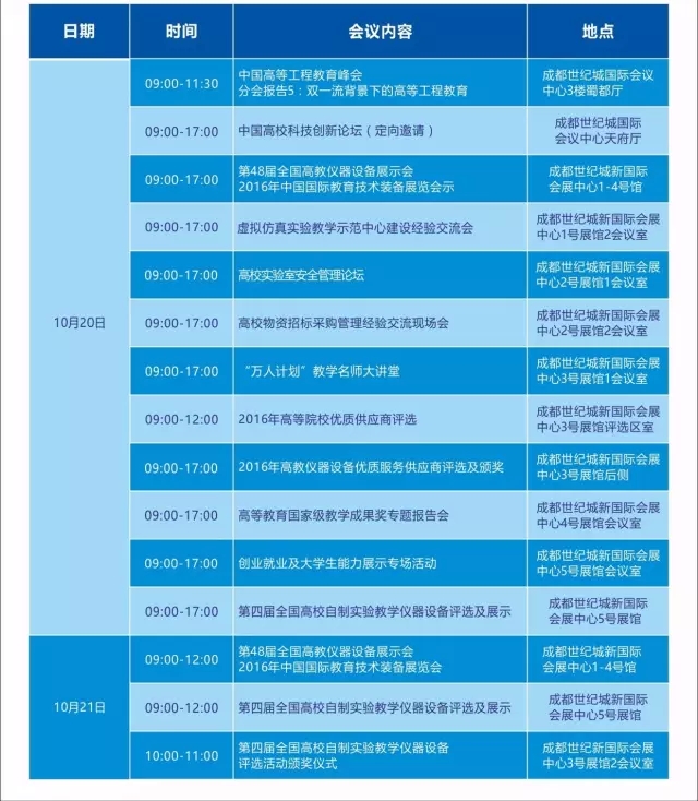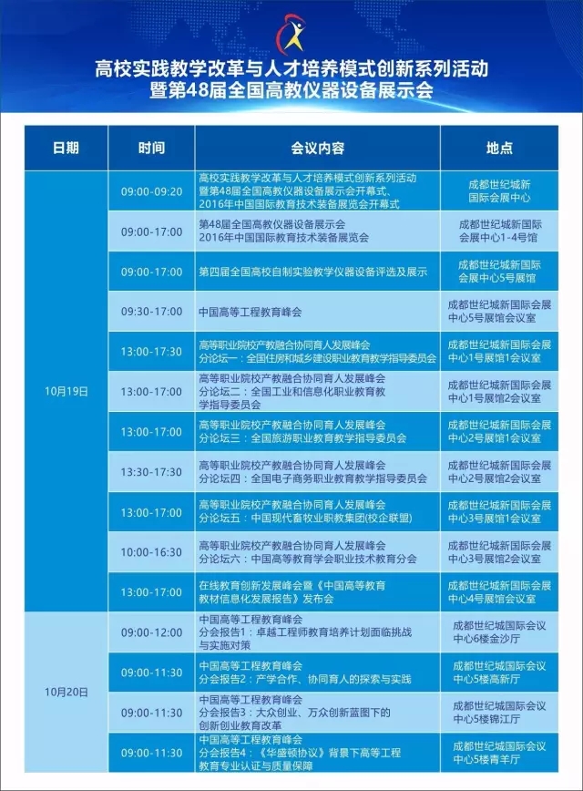 由中國高等教育學會主辦的高校實踐教學改革與人才培養模式創新系列活動暨第48屆全國高教儀器設備展示會(簡稱“系列活動暨展示會”)定于2016年10月18日至21日在成都市舉辦。我校統一組織參會時間為2016年10月20日早上(半天),地點:成都世紀城新國際會展中心,地址:成都市世紀城路198號,請參會師生關注組委會微信公眾號并完成網上在線報名(免費領取電子門票)。
