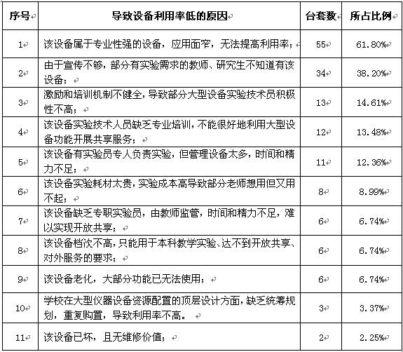 ④宣傳、培訓和管理等問題主要是指部分實驗技術人員缺乏專業培訓,技術水平有待提高,宣傳渠道少,師生對設備擁有、分布、檔次等信息不了解以及設備計劃、調動積極性的激勵機制等問題。