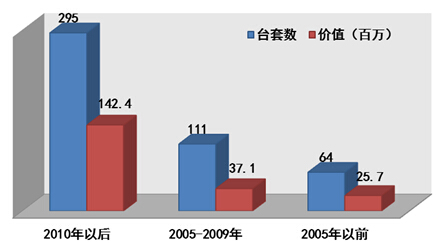單價10萬元以上的大型儀器設備中2010年以后購買的設備占62.77%,2005-2009年間購買的設備占23.62%,2005年以前購買的設備(使用10年以上)占13.62%,具體統計數據詳見圖1-3。