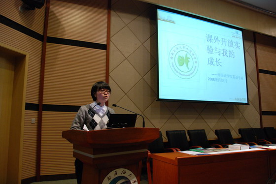 隨后,開放實驗獲獎學生代表黨洲濤、潘波、曾太平、肖舒月做了精彩的交流匯報,他們結合參加開放實驗的親身經歷,感悟頗深。他們說:科研并非遙不可及,其實我們也可以參與其中。一年的學習與實踐,我們感動于老師毫無保留的傳授知識;感動于同學不厭其煩的熱心幫助;我們學會了勤于動手;感悟了團結互助;懂得了學以致用;一次經歷,一次成長,課外開放實驗,讓我們受益頗豐,不僅學習到了很多東西,也收獲了友誼。同時,這次開放實驗的整個過程對我們來說無疑是一次美好的回憶。