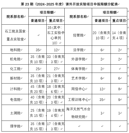 第23期(2024-2025年度)課外開放實驗項目申報限額分配表