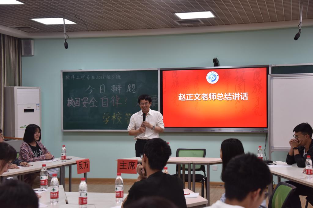班會的辯論環節結束后,趙正文進行了總結發言。他認為正反雙方從不同的角度討論了安全教育的重要性,沒有輸贏,不存在“更”,兩者都很重要,需要互為補充和配合。當回答同學們的 “安全管理教育制度是如何制定的”一題時,他強調了目標導向和問題導向,解釋任何進程的推進都是要經歷一個個階段的,前期有厚積后期才能有薄發。