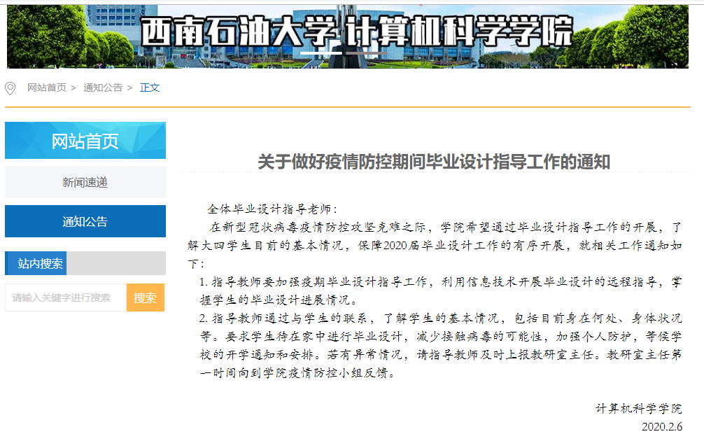 為應(yīng)對當(dāng)前新冠肺炎特殊時(shí)期的線上教學(xué)新形態(tài),計(jì)算機(jī)科學(xué)學(xué)院積極響應(yīng)西南石油大學(xué)《關(guān)于2019-2020學(xué)年春季學(xué)期疫情防控期間本科教學(xué)工作安排的通知》等文件相關(guān)要求,學(xué)院教學(xué)與學(xué)生工作隊(duì)伍配合聯(lián)動,切實(shí)開展了一系列線上教學(xué)準(zhǔn)備工作。