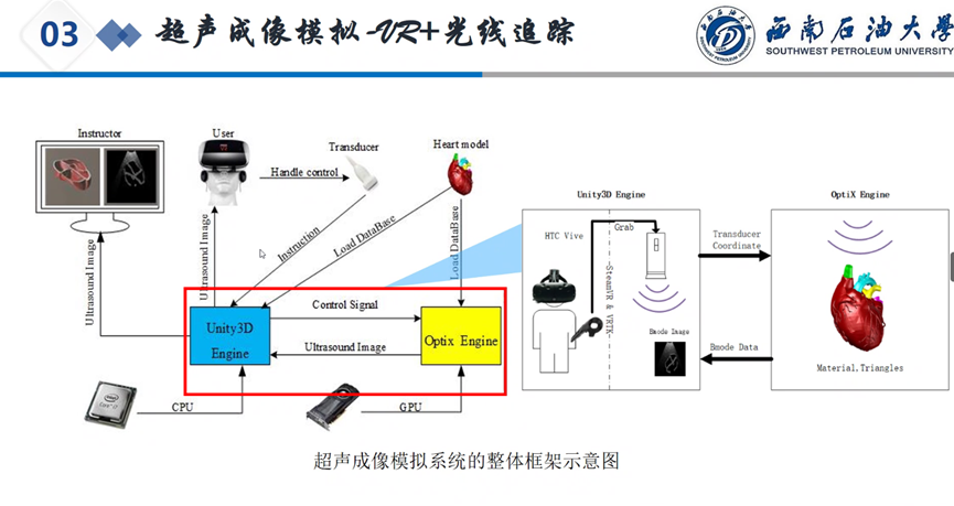 10時(shí)40分,彭博老師開(kāi)始主講。他的學(xué)術(shù)主題是“超聲成像實(shí)時(shí)模擬方法研究”。首先他展示了代表性科研論文,然后介紹了科研人員,最后就是本環(huán)節(jié)的重頭戲——展示超聲模擬的意義,以及在醫(yī)學(xué)等方面的應(yīng)用:模擬方法包括神經(jīng)網(wǎng)絡(luò)、VR+光線追蹤等等。