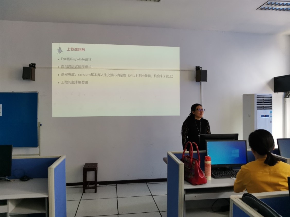 隨后,譙英老師向大家介紹了python程序設計課程怎樣融入課程思政。在函數中,引入從宏觀和微觀的角度看待、解決問題;通過詞云,了解熱點話題。楊緒華老師展示了在C語言中通過復雜問題的分解,讓學生體會,“天下大事必做于細,天下難事必做于易”的思想。張淮鑫老師通過在VB中設置控件,將新疆棉花事件直觀向學生展示,介紹科學家們追求真理的孜孜不倦的精神。