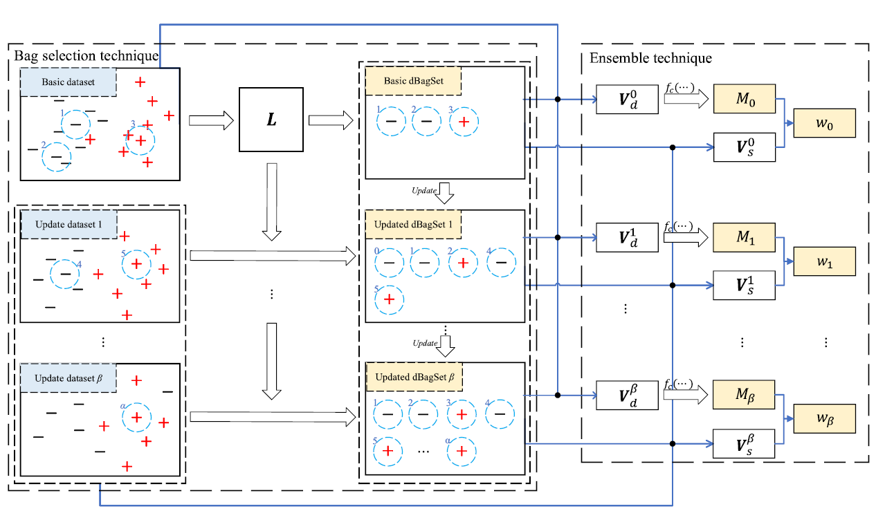 多示例學習是一種比傳統監督學習更具挑戰性的學習范式,其樣本標簽在包級別給出。流行的多示例特征映射方法將每個包轉換為新特征空間的實例。然而,大多數方法無法保證包在新特征空間中的可區分性,且其模型不具備自增強能力。本論文提出了基于辨別包的多示例集成方法,其總體思想如下圖所示。包選擇技術 (bag selection technique) 分析數據集的空間及標簽分布,設計辨別性指標來選擇一組具有辨別性的包,并設計自增強方案,以提升辨別包的辨別能力;集成技術 (ensemble thchnique) 基于辨別包,訓練多個分類器,并按其性能分配權重,用于提升模型的分類性能及穩定性。