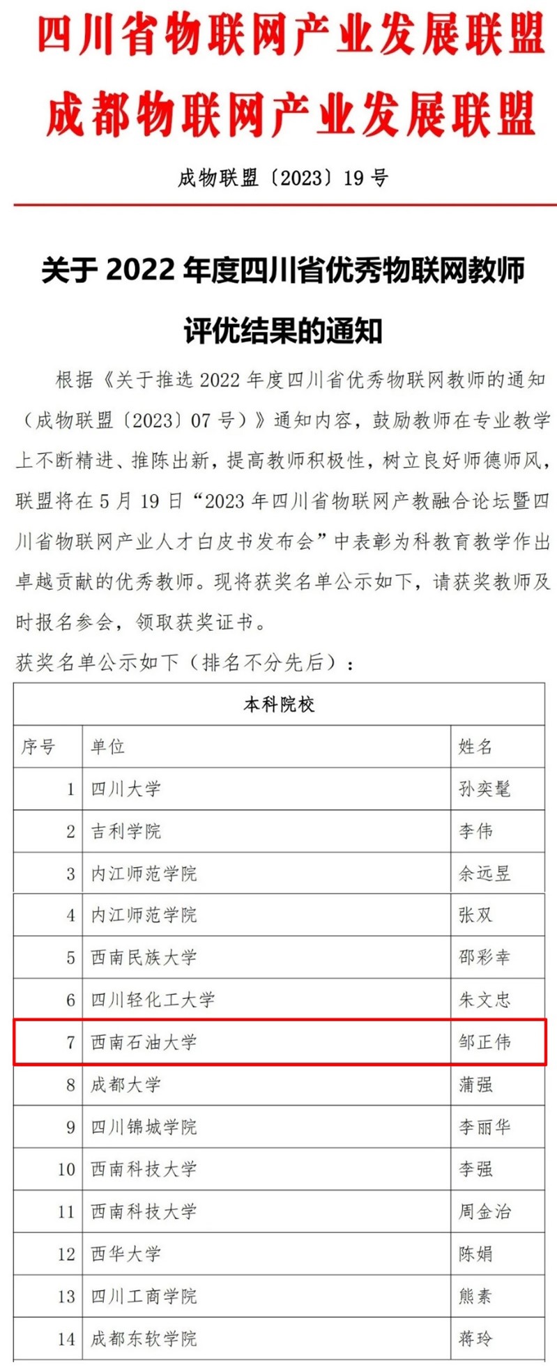 在本次大會上,公布了2022年度四川省優秀物聯網教師,共有14名來自本科院校的教師獲此殊榮,我院物聯網工程教研室鄒正偉老師獲得“2022年度四川省優秀物聯網教師”榮譽稱號。物聯網優秀教師的評選,旨在鼓勵教師在專業教學上不斷精進、推陳出新,致力于產教融合工作,樹立良好師德師風。